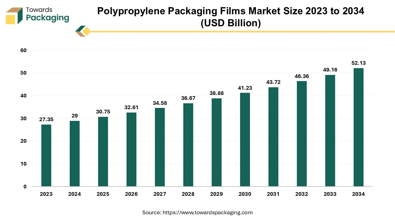 As detailed in the latest report by Towards Packaging, the global polypropylene packaging films market is forecast to grow from USD 32.61 billion in 2026 to about USD 52.13 billion by 2034, at a CAGR of 6.04% between 2025 and 2034.