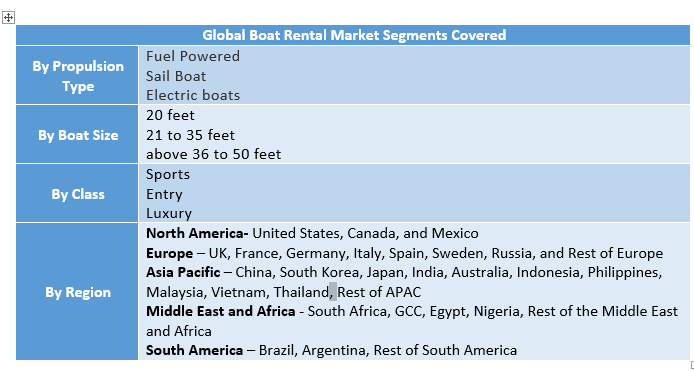 Further, the Boat Rental market is segmented by Propulsion Type, By Boat Size, and geography.