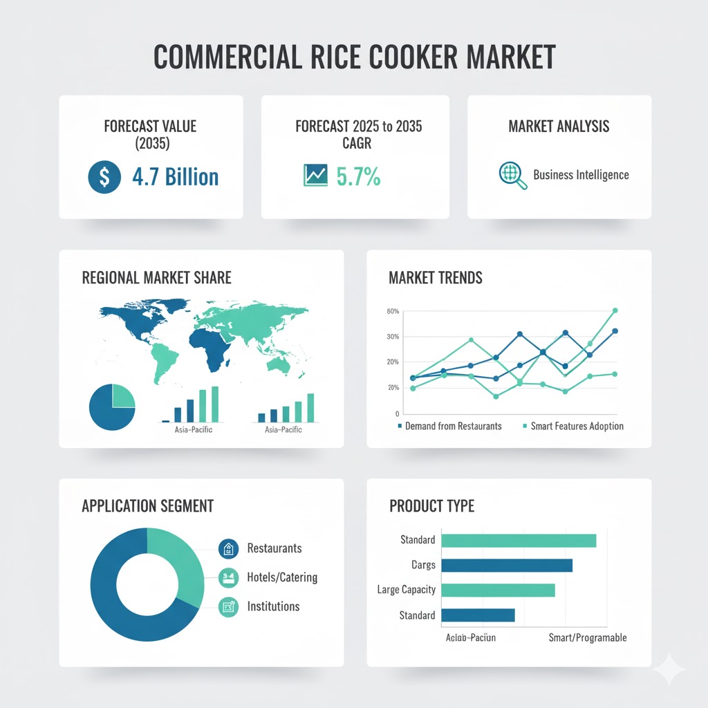 ROCKVILLE, MD, UNITED STATES, October 17, 2025 /EINPresswire.com/ -- The global commercial rice cooker market is on a strong growth trajectory as the foodservice industry, hospitality sector, and institutional kitchens continue to emphasize energy efficiency, operational consistency, and automation. According to a recent report by Fact.MR, the market is projected to expand from USD 2.7 billion in 2025 to approximately USD 4.7 billion by 2035, marking an absolute increase of USD 2.0 billion. This growth translates into a compound annual growth rate (CAGR) of 5.7% between 2025 and 2035.The expansion of the global foodservice sector, coupled with technological innovation in heating elements, smart temperature control, and multi-functional design, is transforming the commercial rice cooker landscape. As restaurants, catering companies, and institutional kitchens seek to enhance productivity while maintaining food quality, manufacturers are responding with advanced, durable, and energy-efficient appliances.