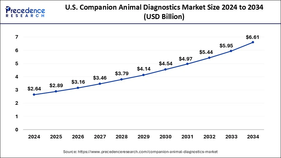 The U.S. companion animal diagnostics market size is worth more than USD 2.89 billion in 2025 and is projected to cross around USD 6.61 billion by 2034, expanding at a CAGR of 9.61% from 2025 to 2034.