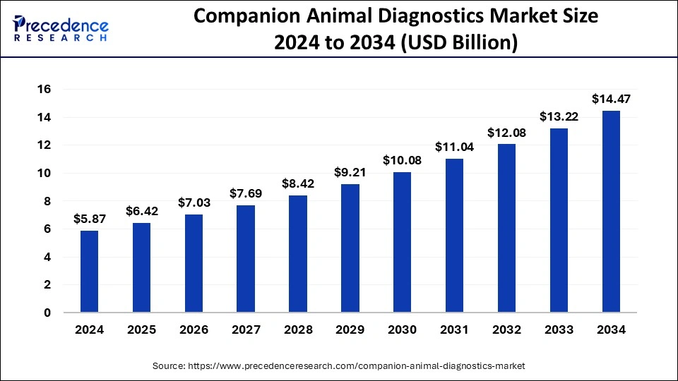 Ottawa, Oct. 22, 2025 (GLOBE NEWSWIRE) -- The global companion animal diagnostics market size is expected to reach nearly USD 14.47 billion by 2034, increasing from USD 6.42 billion in 2025 and is projected to grow at a notable CAGR of 9.45% from 2025 to 2034. The rising adoption of pet insurance, innovation in companion diagnostics, and favorable government initiatives are driving the market's growth.