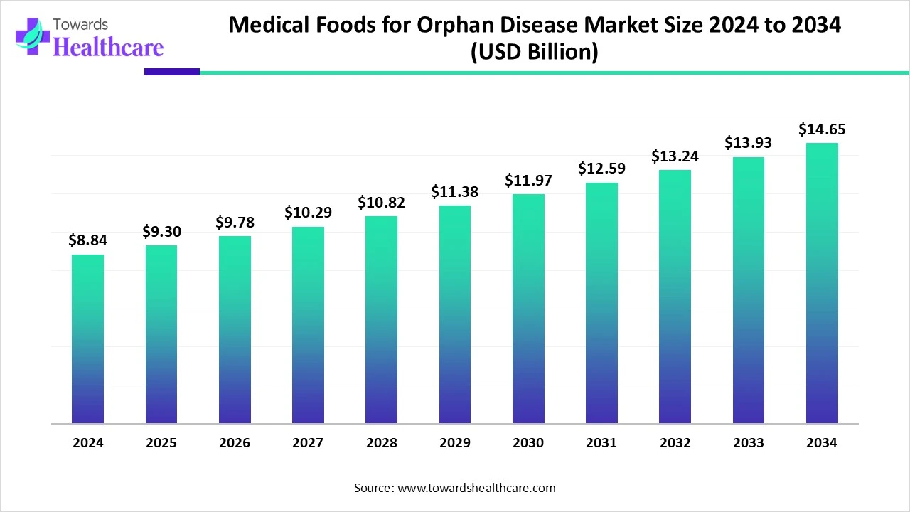 Ottawa, Oct. 22, 2025 (GLOBE NEWSWIRE) -- The global medical foods for orphan disease market size was valued at USD 8.84 billion in 2024 and is predicted to hit around USD 14.65 billion by 2034, rising at a 5.2% CAGR, a study published by Towards Healthcare a sister firm of Precedence Research.