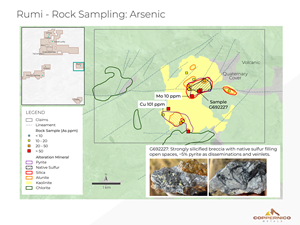 Reconnaissance mapping and initial sampling have outlined a large zone of advanced argillic alteration at the Rumi target, measuring approximately 2.3 km by 2.5 km. The alteration is characterized by kaolinite, alunite, and vuggy to residual silica, with dickite occurring locally. Disseminated pyrite and native sulfur are common throughout the area (Figure 2).